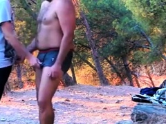 Sexy stud outdoors gets fucked bareback style by two hikers